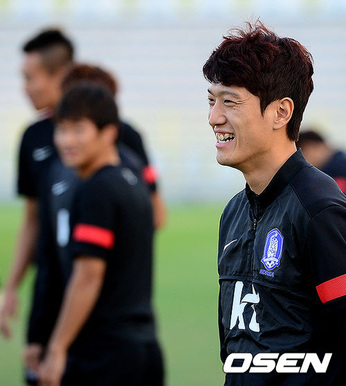 훈련에 앞서 이청용이 미소짓고 있다.