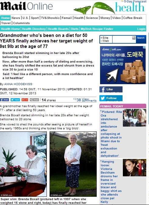 최근 영국 데일리 메일은 영국 남서부 콘웰 뉴퀘이의 퇴직 교사 브렌다 박스올 할머니의 사연을 소개했다. 1950년대 첫 결혼생활의 실패로 체중이 127kg까지 늘어났던 박스올 여사는 지역신문에 공개된 자신의 모습에 큰 충격을 받고 다이어트를 결심, 무려 50년간 목표 체중인 63.5kg까지 감량한 사연을 전달했다.