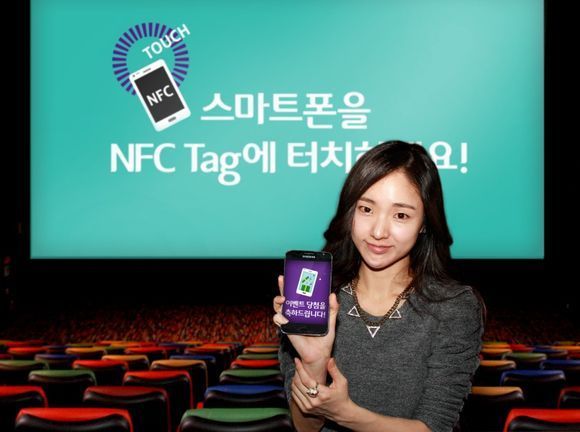 ‘스크린 NFC 양방향 광고 서비스’는 극장에서 관객은 영화 시작 전, 상영관 내 스크린에서 나오는 광고 안내에 따라 앞자리 NFC 칩이 내장된 의자를 자신의 스마트폰으로 태그하면, 다양한 이벤트 등 맞춤형 메시지가 해당 스마트폰에 전달된다.