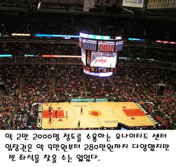 불스의 홈구장 유나이티드 센터는 경기시작 두 시간 전부터 인산인해였다. 경기장으로 진입하는 고속도로의 교통체증이 극심했다. 겨우 빠져나와 29달러짜리 주차장에 차를 댔다. 이날 시카고의 날씨는 영하 1도에 강풍까지 심했다. 하지만 불스 유니폼을 차려 입은 팬들은 아랑곳 하지 않고 바깥에서 질서정연하게 입장을 기다렸다.