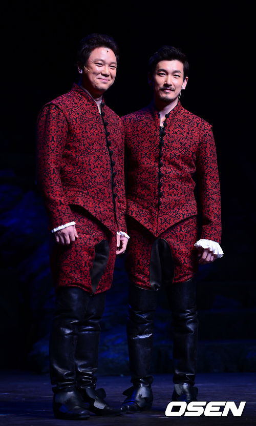배우 정성화와 조승우가 포토타임을 갖고 있다.