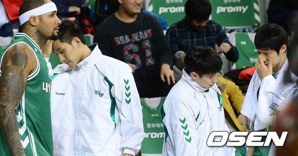 19일 오후 원주종합체육관에서 열린 '2013-2014 KB국민카드 프로농구' 원주 동부 인천 전자랜드의 경기 종료 직전 동부 선수들이 벤치에서 고개를 떨구고 있다.