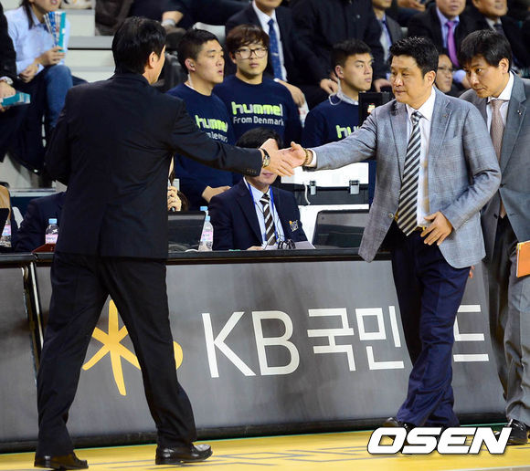 19일 오후 원주종합체육관에서 열린 '2013-2014 KB국민카드 프로농구' 원주 동부 인천 전자랜드의 경기 종료 후 유도훈 감독(오른쪽)과 이충희 감독이 악수를 나누고 있다.