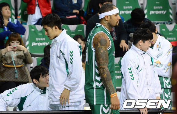 19일 오후 원주종합체육관에서 열린 '2013-2014 KB국민카드 프로농구' 원주 동부 인천 전자랜드의 경기 종료 후 동부 선수들이 벤치에서 고개를 떨구고 있다.