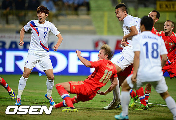 전반 6분 기성용이 올린 코너킥을 먼 포스트에서 쇄도하던 손흥민이 헤딩으로 맞췄다. 이를 러시아 수비가 걷어냈지만, 문전에 있던 김신욱이 오른발로 밀어 넣어 골을 기록했다. 그러나 한국의 리드는 오래가지 못했다. 전반 12분 박스 오른쪽으로 침투한 로만 시로코프가 올린 크로스를 골키퍼 정성룡이 놓치자, 문전으로 쇄도하던 스모로프가 슈팅으로 연결해 동점골을 넣었다.