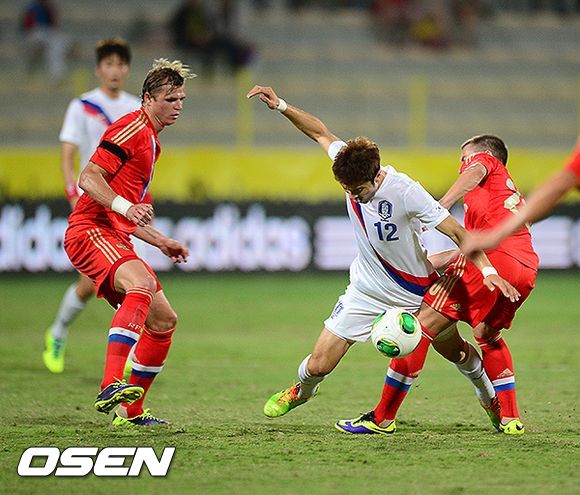 전반 박종우가 러시아 수비에게 반칙을 얻어내고 있다.