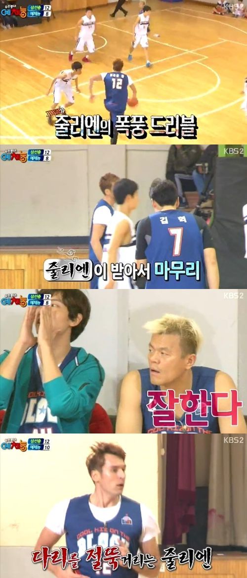 이에 예체능 팀의 에이스 줄리엔은 이들의 수비를 따돌리며 연이어 득점했다. 줄리엔의 모습에 강호동은 "탱크다. 그냥 밀어붙인다"고 감탄했다.