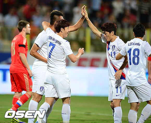 한국은 지난 10월 말리전 3-1승리와 지난 15일 스위스전 2-1 역전승에 이어 처음으로 3연승을 노렸다. 홍명보 감독은 지난 스위스전에서 후반전 두 골을 몰아친 조합인 최전방 김신욱, 좌우날개 손흥민, 이청용, 중앙공격수 이근호를 선발로 출전시켰다.