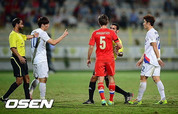 후반 김보경이 러시아 선수들 과격한 행동에 어필하고 있다.