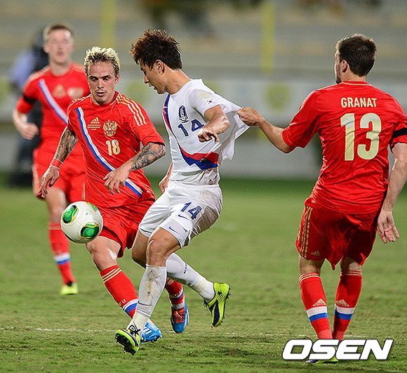 후반 지동원이 러시아 수비에게 반칙을 얻어내고 있다./jpnews@osen.co.kr