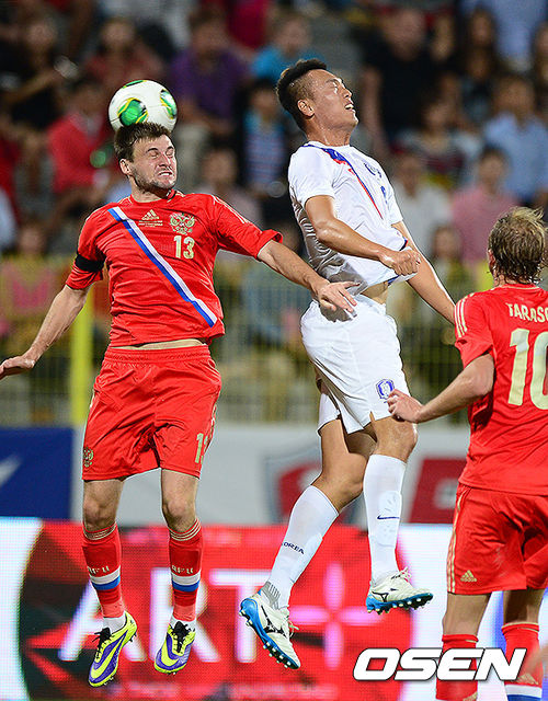 전반 한국 김신욱에 앞서 러시아 수비수가 공중볼을 따내고 있다. /jpnews@osen.co.kr