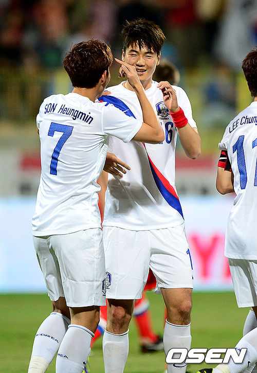 전반 손흥민이 김신욱의 골을 머리로 어시스트하고 기성용과 기뻐하고 있다./jpnews@osen.co.kr