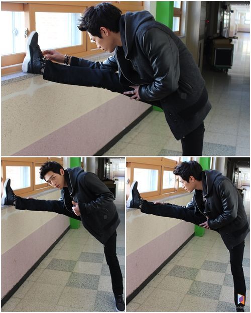 서강준의 소속사 측은 20일 촬영 중 스트레칭을 하며 유연함을 자랑하고 있는 사진을 공개했다. 강한 인상을 주는 검은색 재킷을 소화한 그는 사뭇 진지한 표정으로 다리찢기에 열중하는 엉뚱한 모습을 보였다. 뿐만 아니라 엄지손가락을 번쩍 들며 여유로운 제스처를 취하기도 했다.
