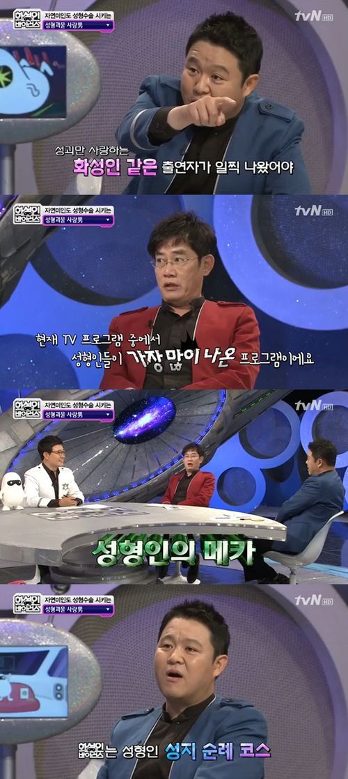 이에 이경규는 “내가 봤을 때 지금 현재 우리나라 채널 프로그램 중에서 성형하신 분들이 제일 많이 나오는 프로그램이다”고 밝혔다.