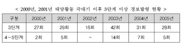 흑점폭발 경보는 올해 같은 태양활동 극대기가 진행되는 과정에서 언제든지 발생할 수 있는 일반적인 현상이며, 지난 2000년 극대기 이후 2005년까지 3단계 이상 경보상황이 다수 발생했던 사례를 비춰볼 때 앞으로도 지속될 가능성이 있다.