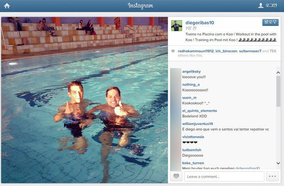 구자철과 볼프스부르크에서 함께 뛰고 있는 디에구(28)는 지난 13일(이하 한국시간) 자신의 인스타그램 계정에 구자철과 함께 수영장에서 찍은 사진 한 장을 올렸다. 디에구는 “KOO와 함께 수영장에서 훈련 중”이라는 짤막한 설명을 덧붙였다.