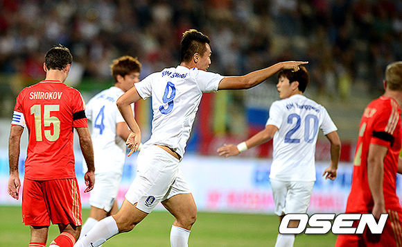김신욱은 20일(이하 한국시간) 새벽 아랍에미레이트(UAE) 두바이 자빌 스타디움서 끝난 러시아전 전반 6분 통쾌한 오른발 선제골을 뽑았다. 한국은 김신욱의 골을 지키지 못하고 전반과 후반 각각 한 골씩을 허용하면서 1-2로 역전패를 당했다.