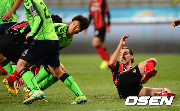 전반 전북 문전을 돌파하는 서울 데얀이 수비에 걸려 넘어지고 있다.