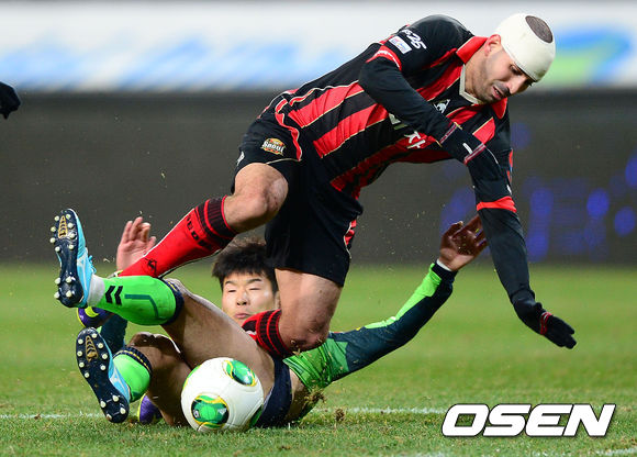 전반 전북 문전을 돌파하는 서울 에스쿠데로가 수비에 걸려 넘어지고 있다.