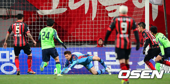 전반 서울 김용대가 전북의 강한슛을 막아내고 있다.