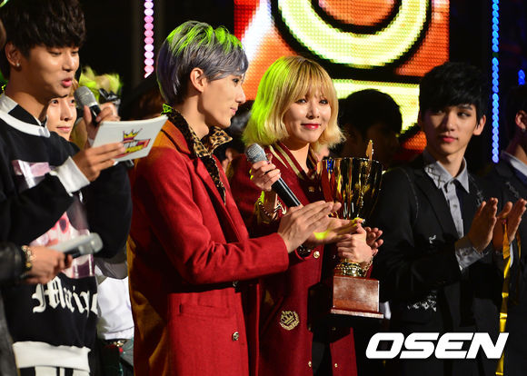 20일 오후 경기도 고양시 일산 장항동 빛마루 방송지원센터에서 열린 MBC MUSIC '쇼 챔피언'에서 1위를 차지한 트러블메이커 현아와 현승이 앙코르 무대를 펼치고 있다
