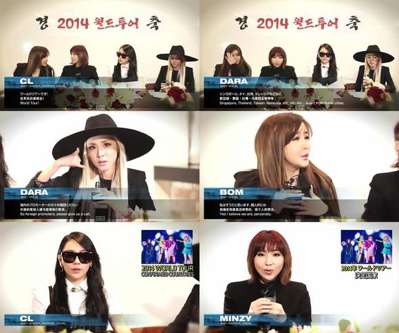 붓글씨로 쓴 듯한 '경축 2014 월드투어'라는 플랜카드가 걸린 흰 벽을 배경으로 리더 씨엘은 영어, 산다라박은 중국어, 민지는 일본어, 박봄은 한국어로 이번 투어를 소개했다.