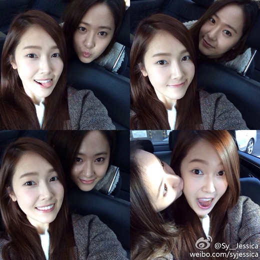 사진 속에서 자동차 좌석 앞뒤로 앉아 카메라를 향해 다양한 포즈를 취하며 미모를 뽐내고 있다. 특히 크리스탈이 언니 제시카에게 애교 있게 볼에 뽀뽀, 자매의 돈독한 우애를 과시했다.