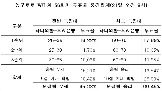 국민체육진흥공단(www.kspo.or.kr)이 발행하는 체육진흥투표권 수탁사업자인 스포츠토토의 공식 온라인 발매 사이트 베트맨(www.betman.co.kr)이 오는 22일 오후 7시 부천실내체육관에서 벌어지는 WKBL 하나외환-우리은행전 대상 농구토토 W매치 56회차 게임 투표율을 중간 집계한 결과, 참가자의 60.45%는 원정팀 우리은행의 압승을 예상했다고 밝혔다.