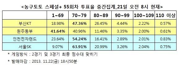 투표율을 살펴보면, 전자랜드 70점대(54.24%)와 서울SK 70점대(63.91%)가 최다를 기록하며 1순위를 차지했다.