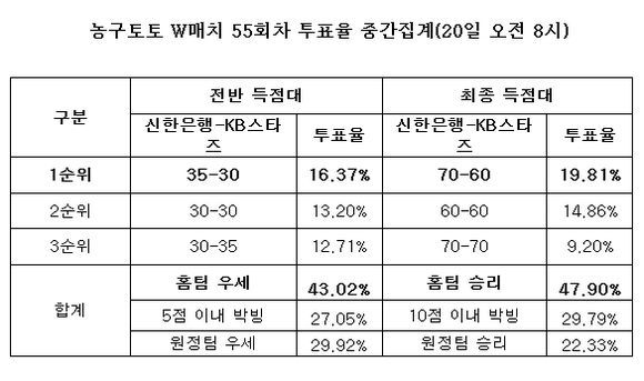 농구토토 W매치 55회차 투표율 중간집계 결과…47% 신한은행 승리 예상