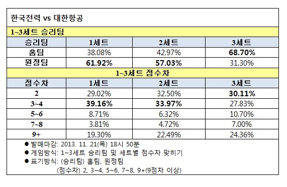 1~3세트 승리팀과 점수차를 맞히는 배구토토 매치 게임에서 세트별 예상 승리팀은 1세트 대한항공 승리(61..92%), 2세트 대한항공 우세(57.03%), 3세트 한국전력 승리(68.70%)로 나타나 1세트와 2세트는 대한항공이, 3세트는 한국전력이 우세할 것으로 예상됐다.