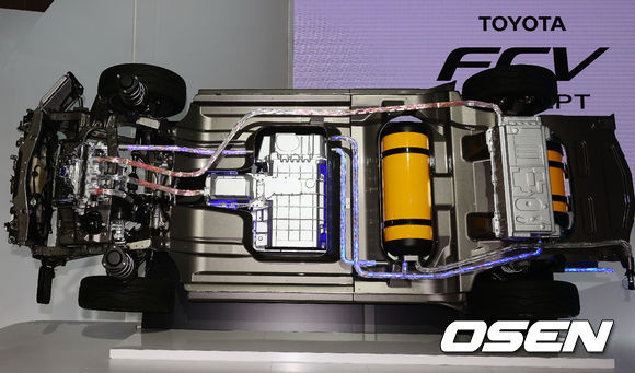 '토요타 FCV(Fuel Cell Vehicle) 콘셉트'는 세단 타입의 전용 바디에 소형·경량화한 자사 개발의 신형 연료전지 FC 스택과 70 MPa의 고압 수소탱크 2개를 하부에 배치한 고효율 패키지를 적용했다.
