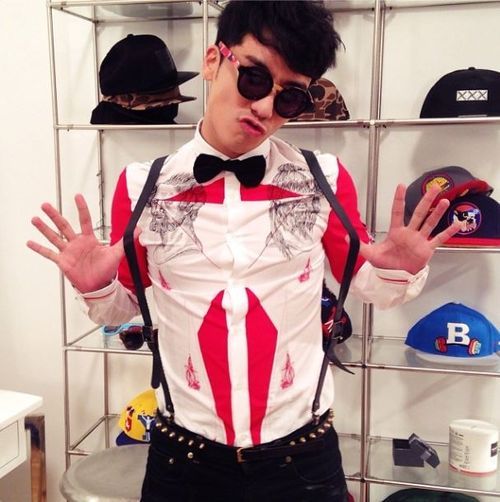 사진 속 승리는 엄지 손가락으로 서스펜더를 늘리며 익살스러운 포즈을 취하고 있다. 선글라스를 낀 채 입술을 삐죽거리고 있는 표정이 귀엽다.
