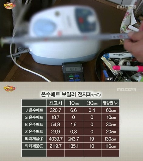 현재 우리나라 전자파 인체 보호 수치는 833mG인데, 한 온수매트에서는4039.7mG(미리가우스)에 가까운 전자파가 발생해 기준치의 5배에 가까운 수치를 보였다.