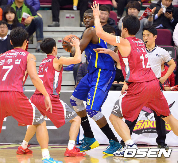 21일 오후 경남 창원시 두대동 창원실내체육관에서 열린 '2013-2014 KB국민카드 프로농구' 창원 LG와 서울 삼성의 경기, 1쿼터 삼성 더니건이 패스 시도하고 있다.