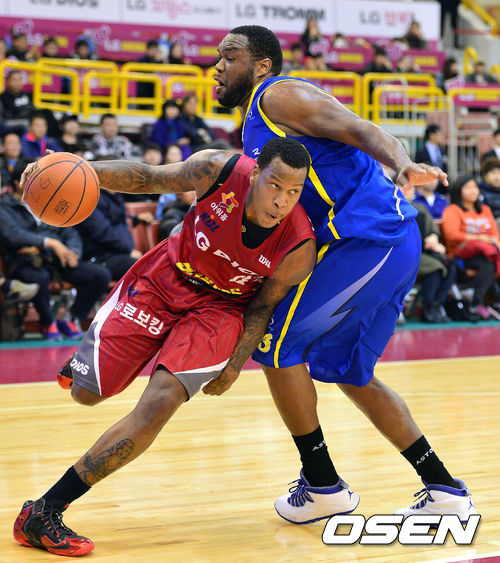 21일 오후 경남 창원시 두대동 창원실내체육관에서 열린 '2013-2014 KB국민카드 프로농구' 창원 LG와 서울 삼성의 경기, 1쿼터 LG 제퍼슨이 삼성 존슨을 상대로 돌파하고 있다.