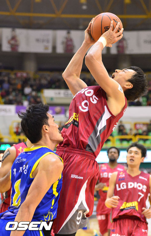 21일 오후 경남 창원시 두대동 창원실내체육관에서 열린 '2013-2014 KB국민카드 프로농구' 창원 LG와 서울 삼성의 경기, 2쿼터 LG 김영환이 페이드어웨이 슛을 시도하고 있다.
