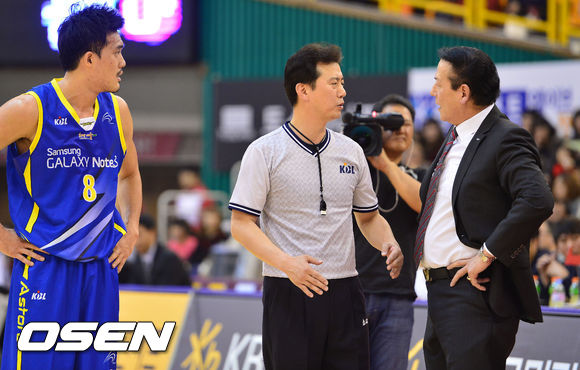 21일 오후 경남 창원시 두대동 창원실내체육관에서 열린 '2013-2014 KB국민카드 프로농구' 창원 LG와 서울 삼성의 경기, 2쿼터 삼성 김동광 감독이 차재영의 파울판정에 항의하고 있다.