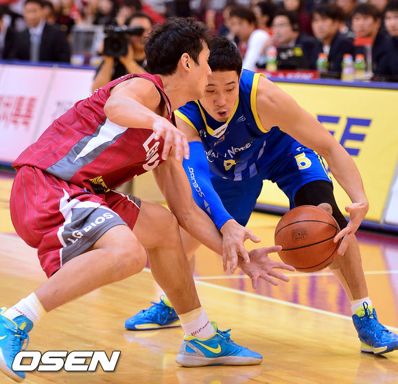 21일 오후 경남 창원시 두대동 창원실내체육관에서 열린 '2013-2014 KB국민카드 프로농구' 창원 LG와 서울 삼성의 경기, 3쿼터 이정석이 LG 양우섭의 수비를 상대로 드리블하고 있다