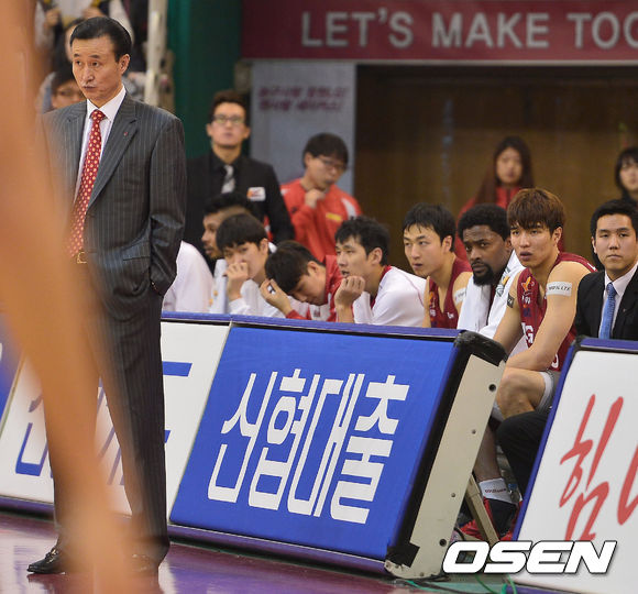 4쿼터 패색이 짙어진 LG 벤치 김진 감독과 김종규가 아쉬워하고 있다./ soul1014@osen.co.kr