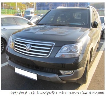 이 날 최고가 낙찰차량은 4만 7000km를 주행한 2011년식 모하비 3.0VGT(4WD) KV300 가 차지했으며, 금액은 3,155만원에 낙찰됐다.