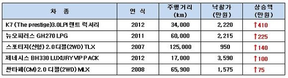 총 출품 차량은 272대로 이 중 167대가 낙찰됐으며, 고객의 희망가 대비 낙찰가가 상승한 주요 차량은 표와 같다.