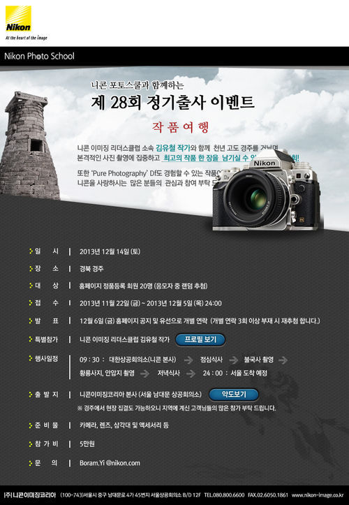 니콘 포토스쿨 정기출사의 연장선상에서 실시되는 이번 행사는 참가자들과 경상북도 경주의 불국사, 황룡사지 등을 방문할 예정이며 특히 안압지의 아름다운 야경을 카메라에 담는 일정으로 구성되었다. 각 촬영 장소마다 김유철 작가의 조별 지도가 실시되고 신제품 Df를 대여해 직접 촬영할 수 있는 체험 기회도 제공한다.