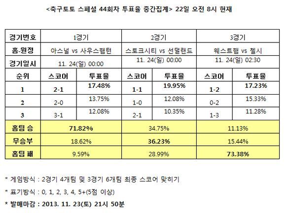 잉글랜드 프리미어리그(EPL) 3경기 대상 축구토토 스페셜 44회차 투표율 중간집계 결과