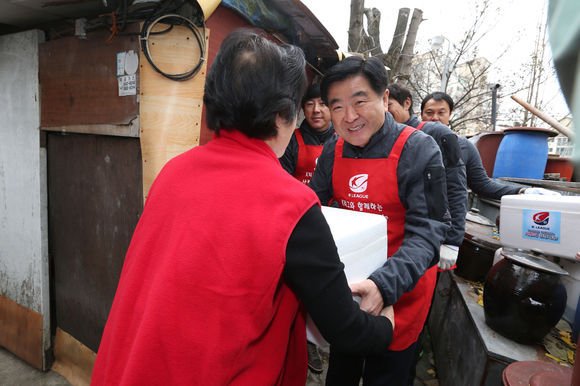 남현동 소재 독거노인 가정에 직접 담근 김장김치를 배달하고 있는 권오갑 연맹 총재와 신태용, 이운재, 유상철 K리그 홍보대사 / 한국프로축구연맹 제공.