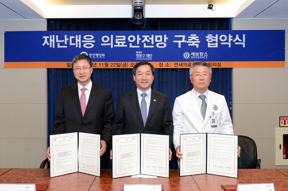 현대차 정몽구 재단은 22일 서울 서대문구에 위치한 세브란스병원에서 유영학 현대차 정몽구 재단 이사장, 유정복 안전행정부 장관, 이철 연세의료원장 등 주요 관계자들이 참석한 가운데 재난대응 의료안전망 구축에 관한 업무 협약을 체결하고, 사업단을 발족했다.