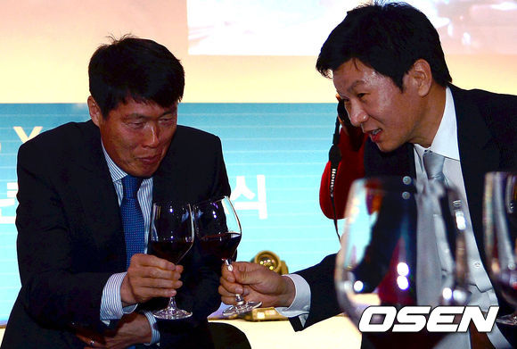 정몽규 대한축구협회장과 차범근 축구해설위원이 건배를 하고 있다.
