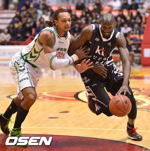 22일 오후 부산 사직실내체육관에서 열린 '2013-2014 KB국민카드 프로농구' 부산 KT와 원주 동부의 경기, 1쿼터 KT 리처드슨이 동부 랜들맨의 수비를 뿌리치며 돌파시도하고 있다