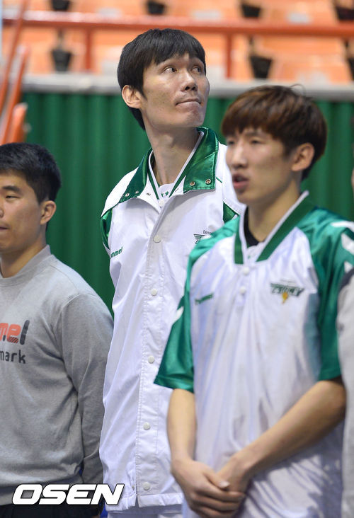 22일 오후 부산 사직실내체육관에서 열린 '2013-2014 KB국민카드 프로농구' 부산 KT와 원주 동부의 경기, 1쿼터 동부 김주성이 벤치 뒤에서 전광판을 바라보고 있다