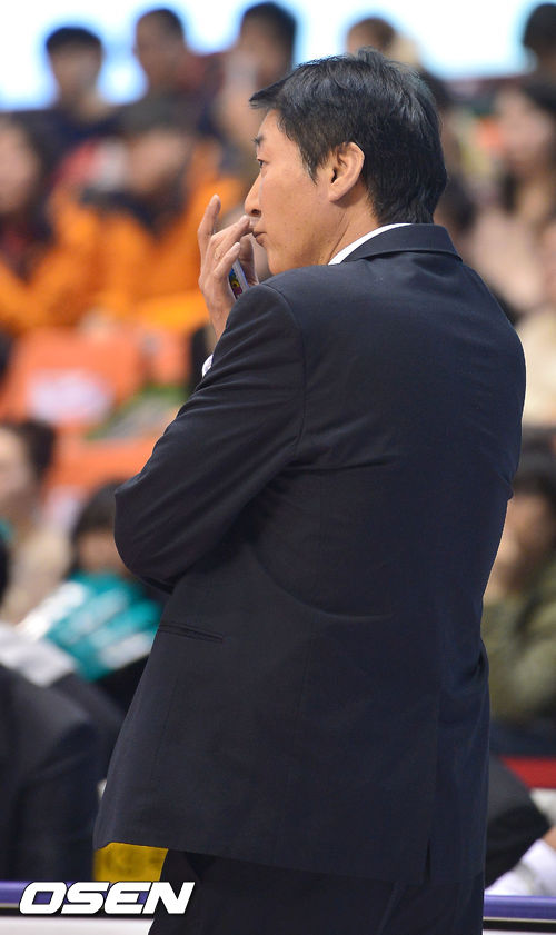 22일 오후 부산 사직실내체육관에서 열린 '2013-2014 KB국민카드 프로농구' 부산 KT와 원주 동부의 경기, 2쿼터 동부 이충희 감독이 10점차로 경기가 끌려가자 아쉬워하고 있다